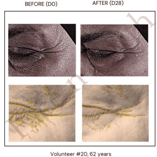 - Fine lines, crow’s feet, and loss of smoothness around the eyes